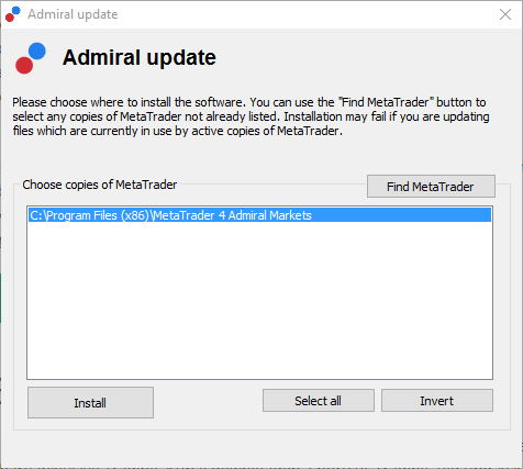 下载完成后,打开 .zip文件并且双击 .zip 文档里面的Admiral-MT4-Apps.exe 文件 即可运行插件。此操作将会启动安装助手。